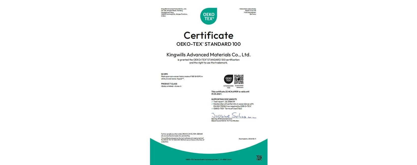 Flashspun Hypak™ has been certified by OEKO-TEX® STANDARD 100 and granted the right to use